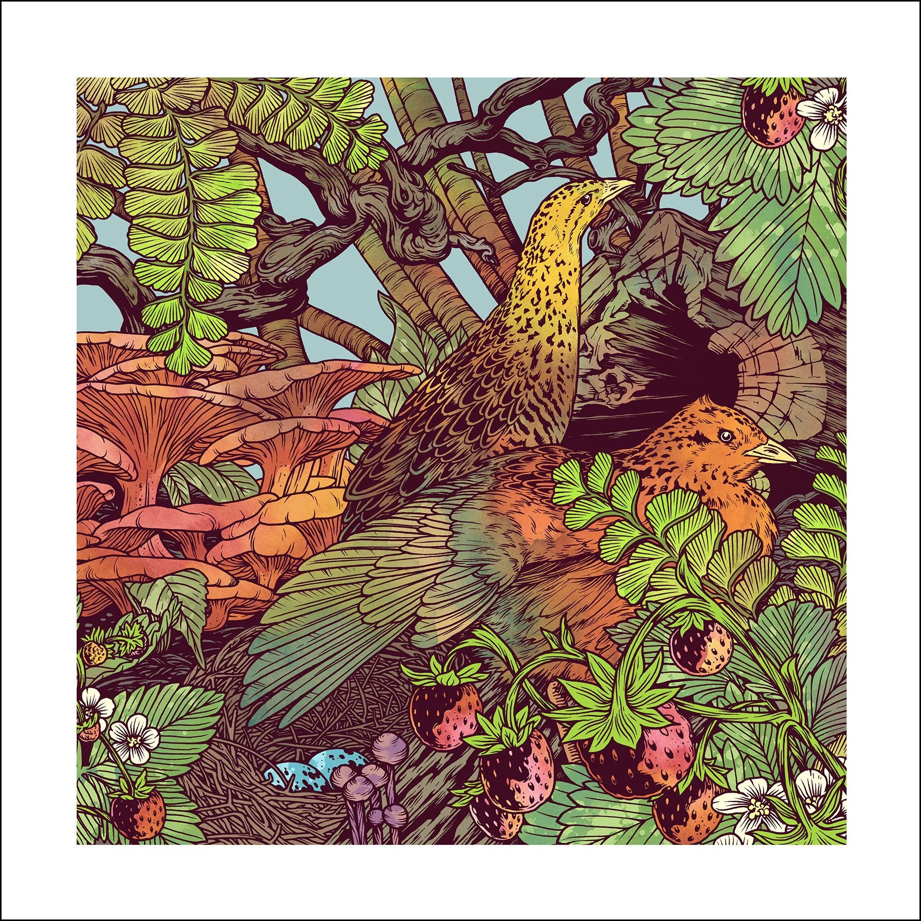 A rich nature scene depicting 2 grouse in dense wood protecting their precious eggs. Art by Zach Johnsen.